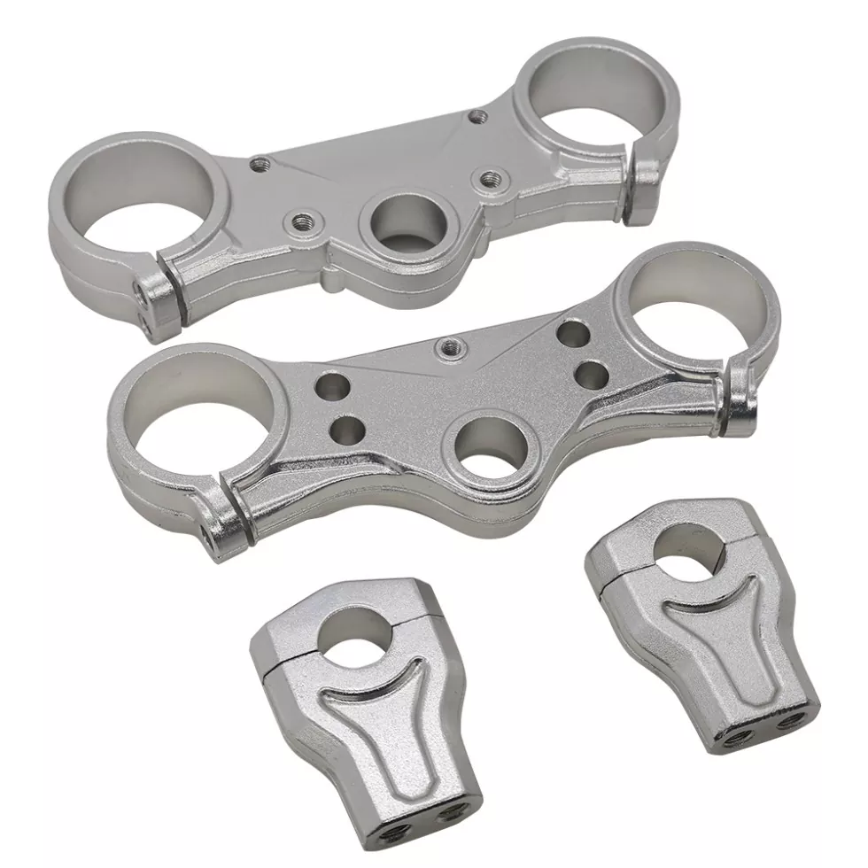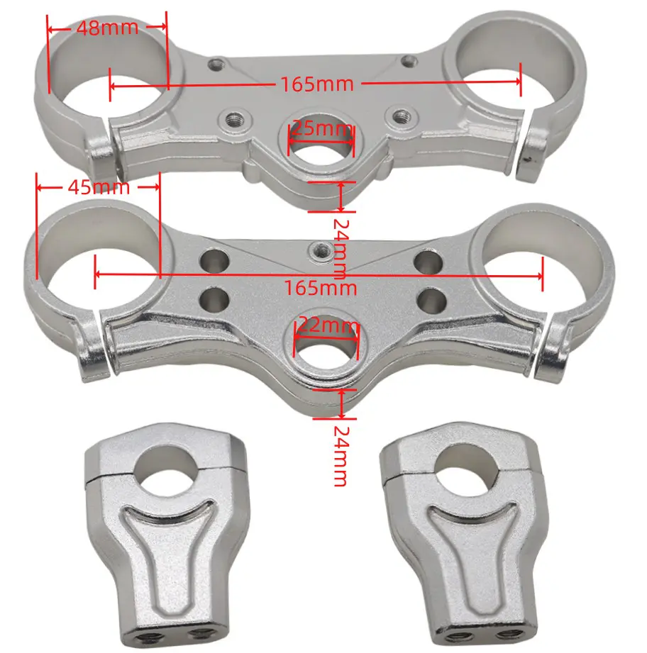 45 मिमी 48 मिमी बनावट ट्रिपल क्लॅम्प उच्च-शक्तीच्या बनावट ॲल्युमिनियमपासून तयार केले गेले आहे, जे अपवादात्मक टिकाऊपणा आणि दबावाखाली वाकण्यासाठी प्रतिकार प्रदान करते. त्याची अचूक रचना राइड दरम्यान सुधारित नियंत्रणासाठी हाताळणी आणि स्थिरता वाढवून, इष्टतम फिट आणि संरेखन सुनिश्चित करते. हलके पण मजबूत, हे क्लॅम्प सर्व आवश्यक हार्डवेअर समाविष्ट करून स्थापित करणे सोपे आहे, सेटअप त्रास-मुक्त करते. स्पर्धात्मक रेसिंग, ऑफ-रोड राइडिंग आणि सानुकूल बिल्डसाठी आदर्श, 45 मिमी 48 मिमी बनावट ट्रिपल क्लॅम्प विविध मोटरसायकलसाठी कार्यक्षमता आणि सुरक्षितता वाढवते, ज्यामुळे ती उत्साही आणि दैनंदिन रायडर्स दोघांसाठी एक बहुमुखी पर्याय बनते.